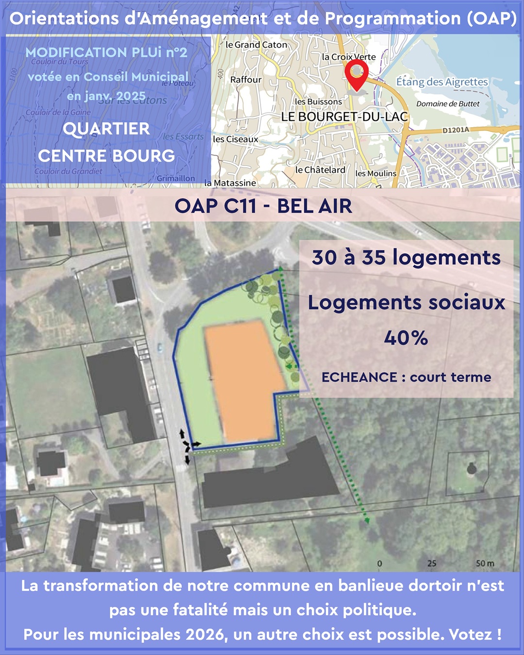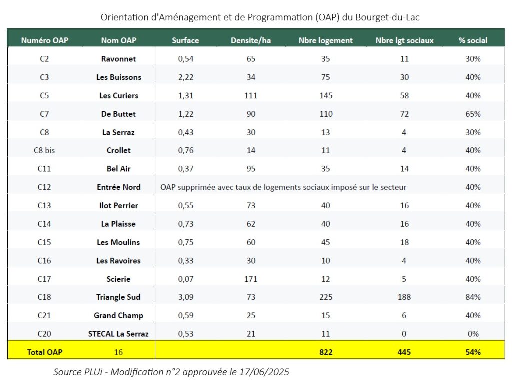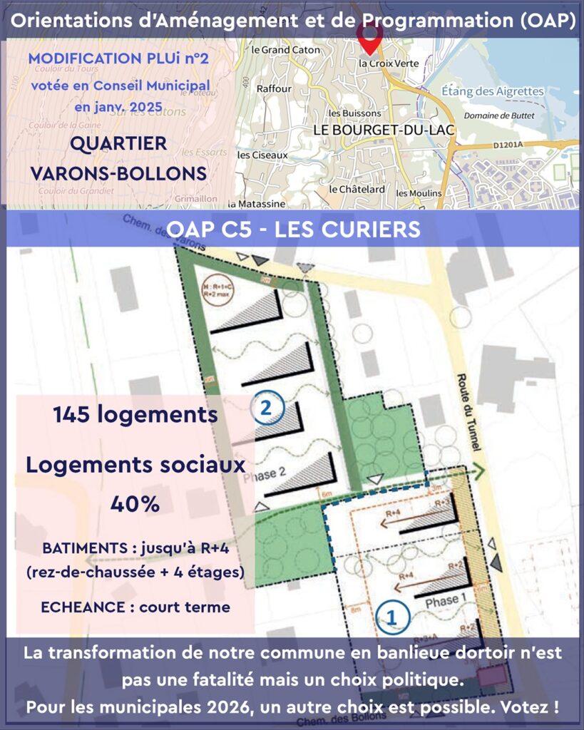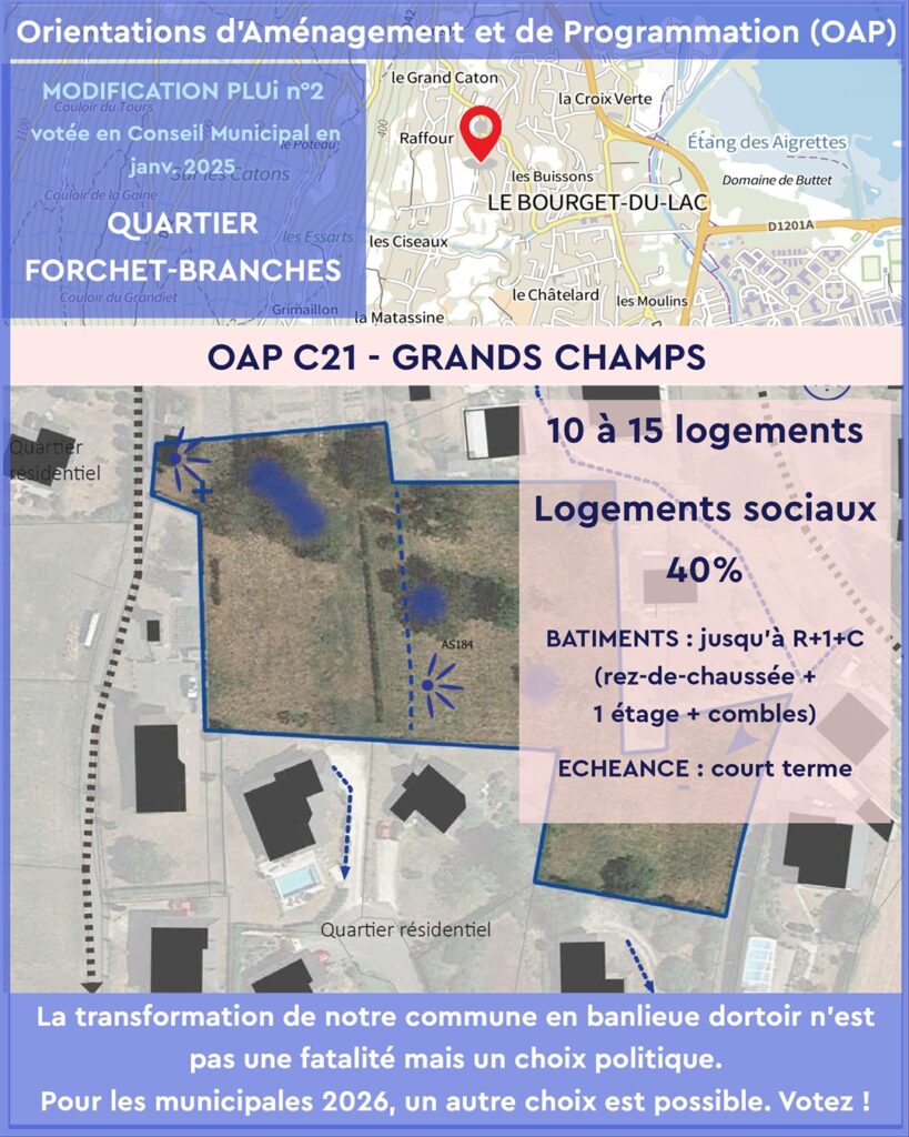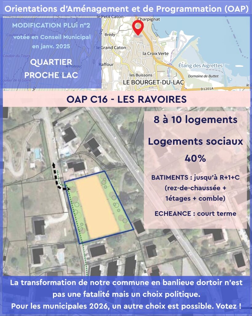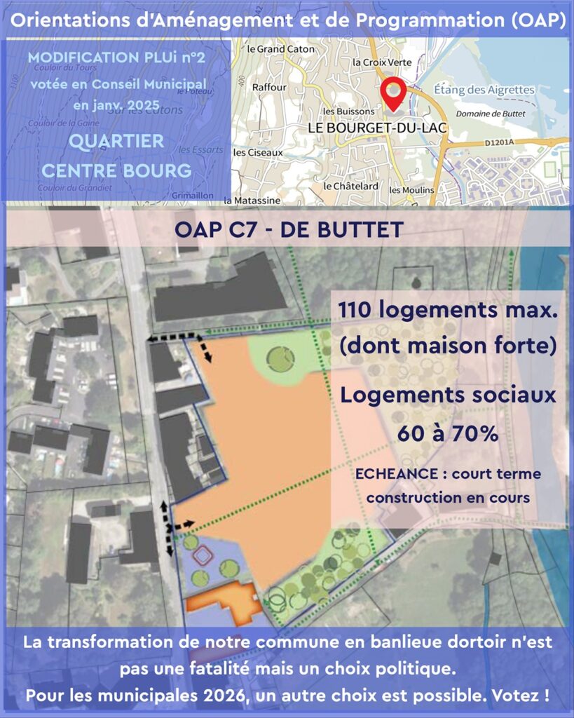 Les OAP votées en janvier 2025 par l’équipe municipale actuelle imposent une densification rapide et mal maîtrisée dans plusieurs quartiers emblématiques du Bourget-du-Lac :