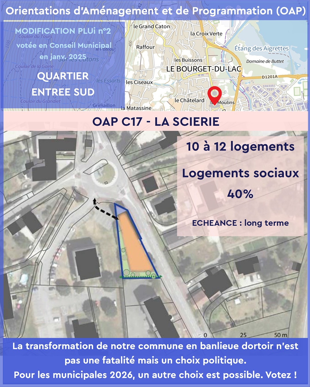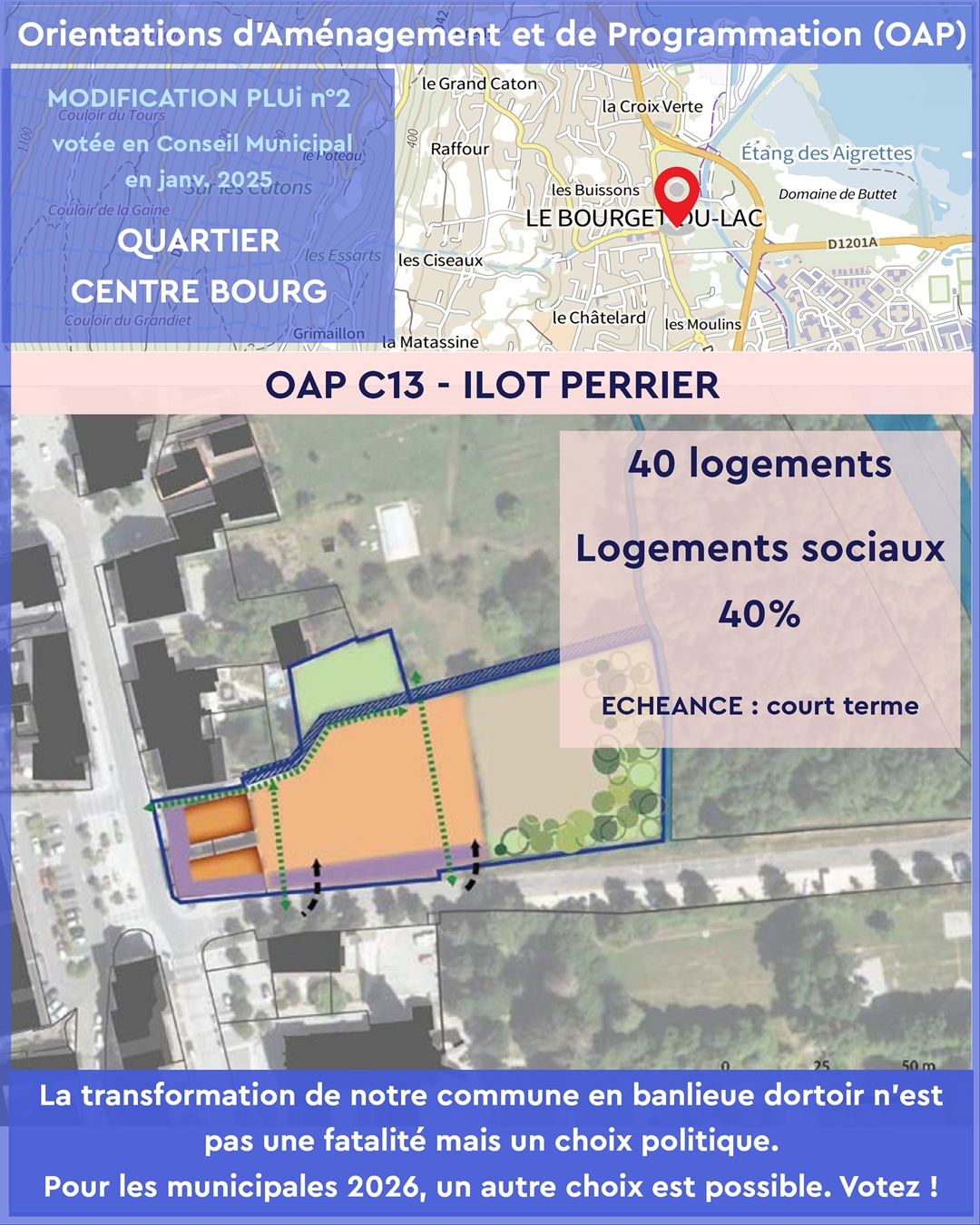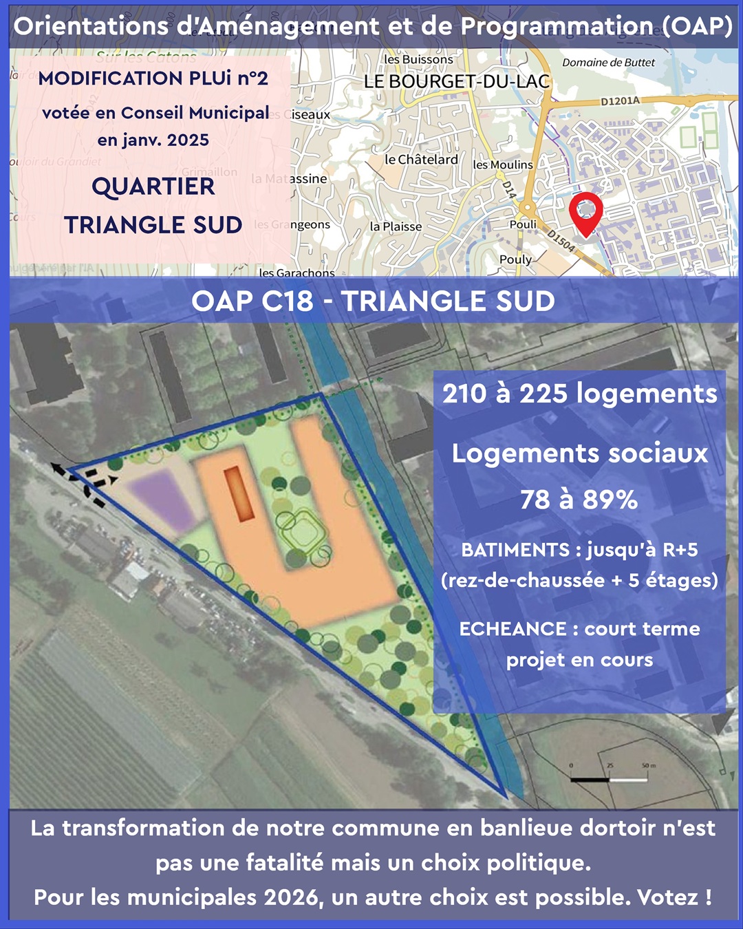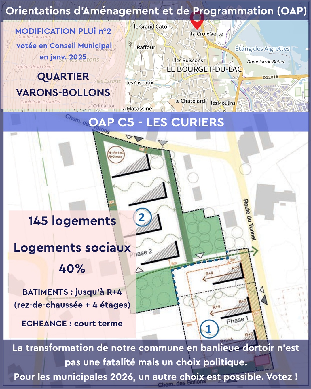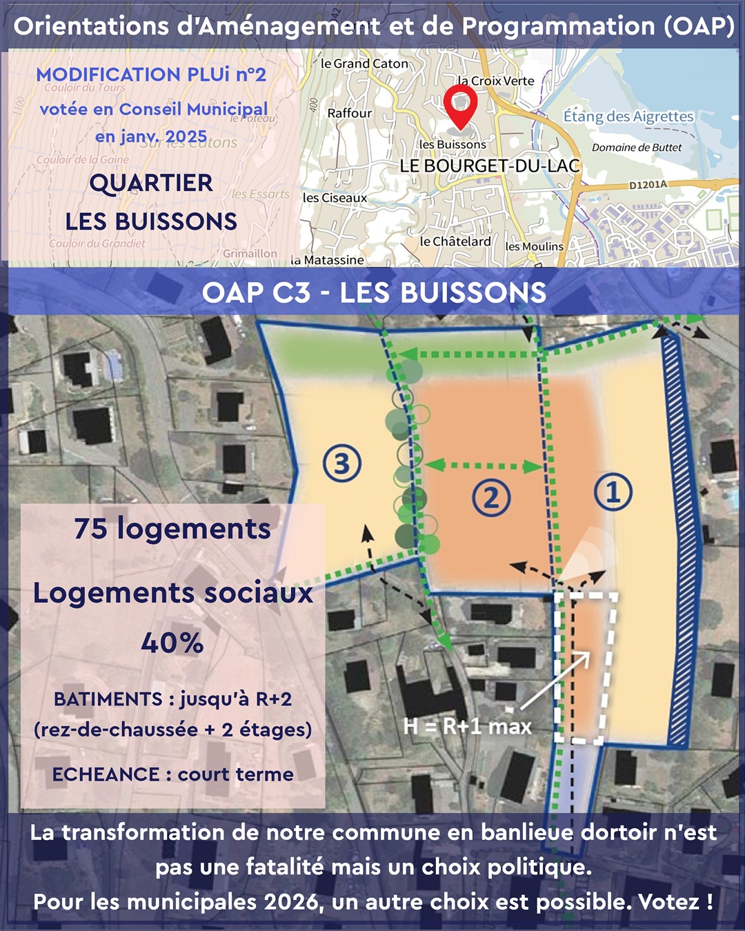Les OAP votées en janvier 2025 par l’équipe municipale actuelle imposent une densification rapide et mal maîtrisée dans plusieurs quartiers emblématiques du Bourget-du-Lac :