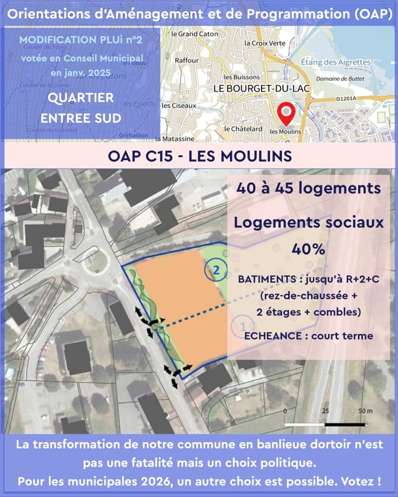 - OAP C15 – Les Moulins (Entrée Sud) : 40 à 45 logements, dont 40% sociaux, également à court terme. Une densité supplémentaire qui menace la tranquillité de ce quartier résidentiel et son intégration paysagère.