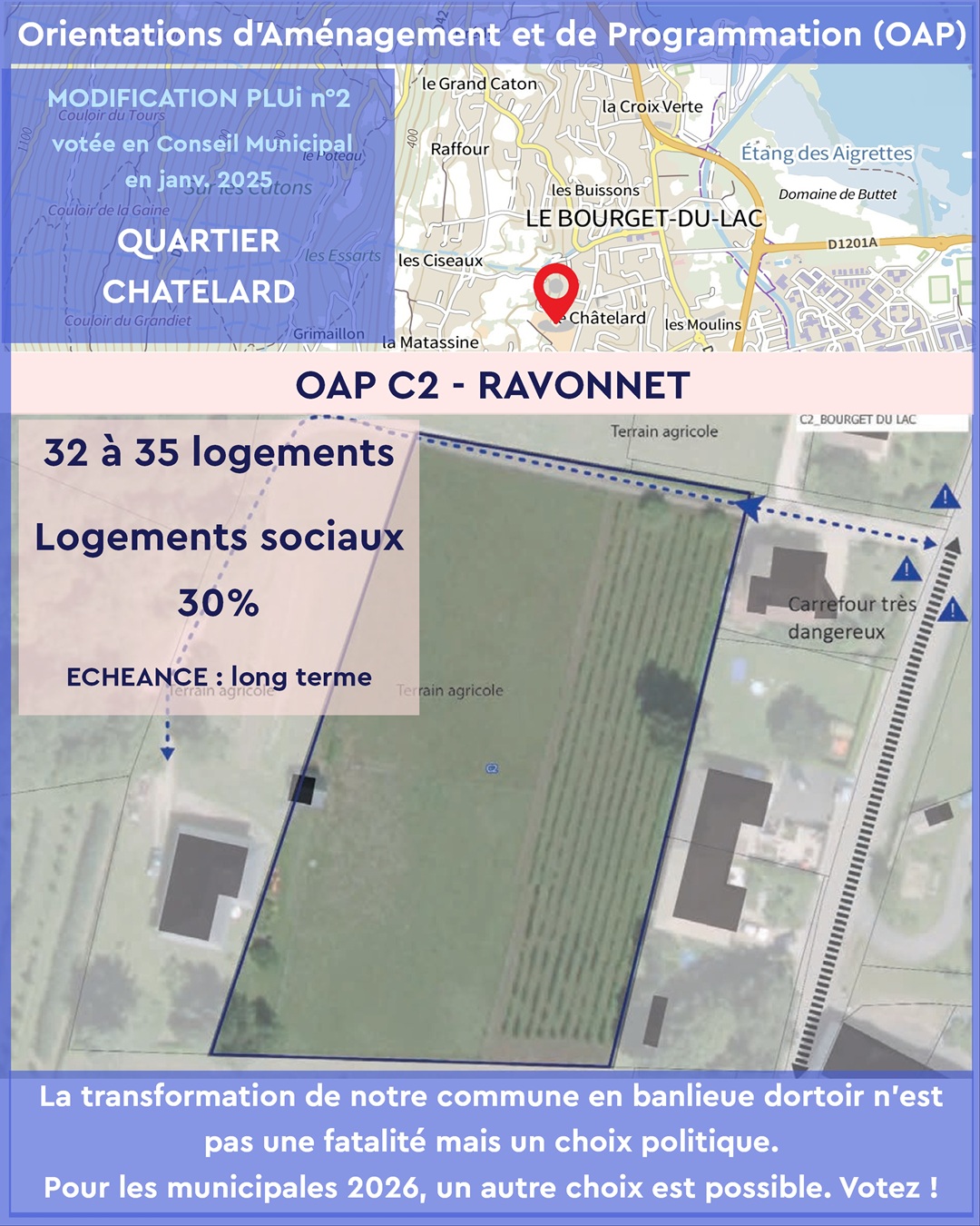 - OAP C2 – Ravonnet (Châtelard) : 32 à 35 logements, dont 30% sociaux, à long terme. Ce projet, bien que moins urgent, s’inscrit dans la même dynamique de densification, sans réponse claire aux besoins en équipements et services publics.