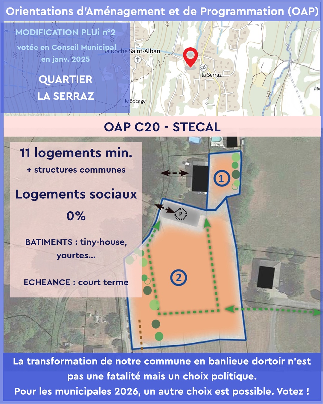 - OAP C20 – La Serraz : 11 logements provisoires (tiny-houses et yourtes), avec 0% de logements sociaux malgré un portage par l’OPAC. Une incohérence qui interroge sur la cohérence des choix municipaux.